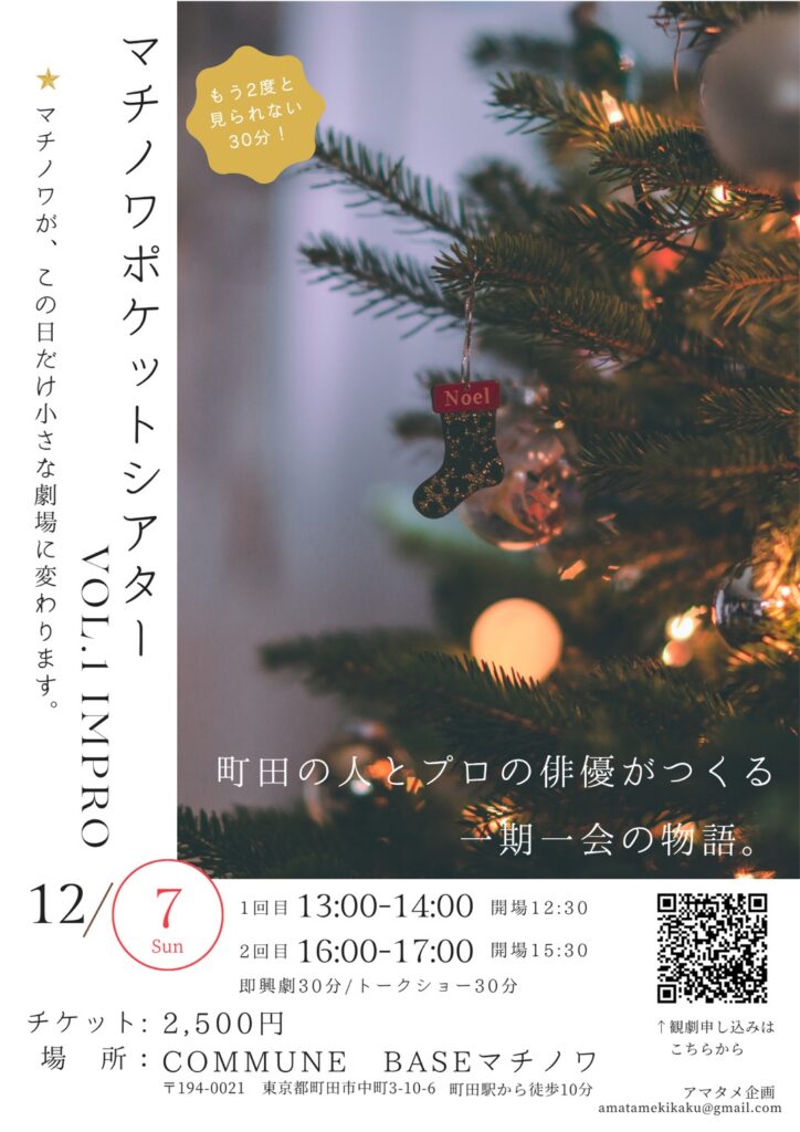 アマタメ企画さんによる「町田の人とプロの俳優がつくる一期一会の物語」という即興劇がマチノワで行われます。