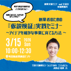 2026年3月15日に行われるのは、創業者のための『仮説検証』実践セミナー ~アイデアを確かな事業に育てる方法 ~です。